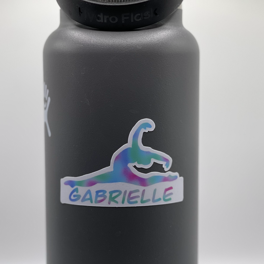 Colorful Silhouette of a gymnast doing a beautiful leap with your personalized name underneath. Please give us your name or short phrase and we will personalize the sticker! Great idea for gymnastic team gifts!! Show your team spirit with vinyl stickers to go on your water bottle, laptop, locker, or any other smooth surface! Sticker is topped with laminate for protection and water resistance.