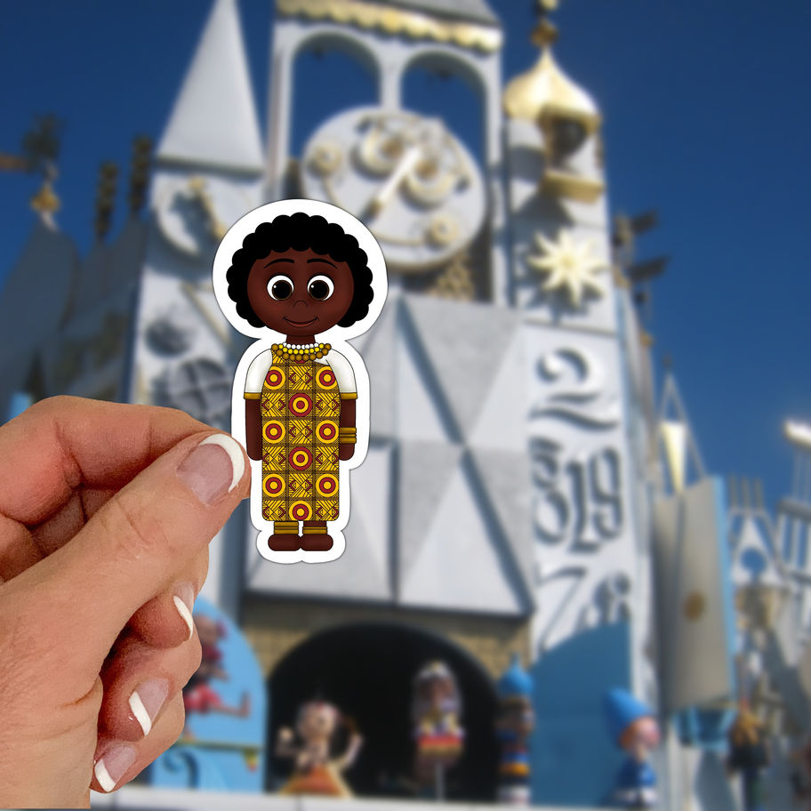 It's a Small World after all! Get this cute Small World Africa Doll Vinyl Sticker. Check other listings for other Small World Dolls! Vinyl stickers go on your water bottle, laptop, locker, or any other smooth surface! Sticker is topped with laminate for protection and water resistance.